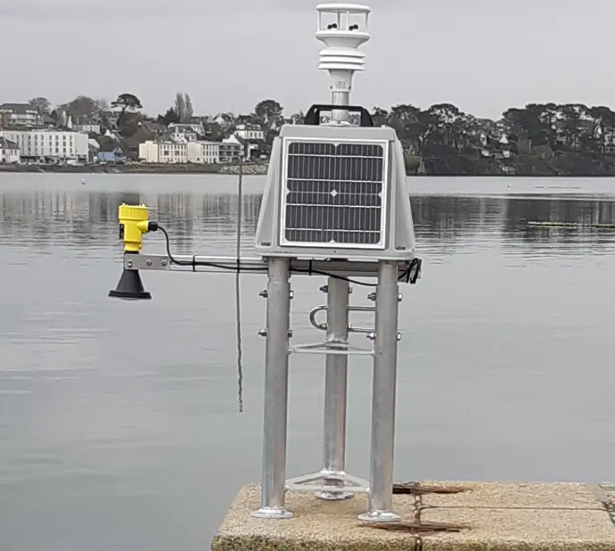 Développé en partenariat avec le SHOM, il s’installe très facilement avec son trépied, et embarque une station météo, une pyramide solaire incluant une batterie et un régulateur de charge, un GPS, un radar de mesure, et une carte d’acquisition et stockage des mesures munie d’un module 3G/4G et de connectivité Bluetooth et